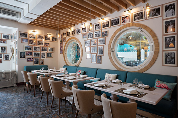 該紅網餐廳位于索契黑海沿岸是以鄉村風格為主題打造。公共服務臺被幾百片藍色小魚鱗所包圍,配以淡黃色的暗藏燈光,讓整個空間顯的格外的融洽。值得我們注意的是白色做舊柱子,每根柱子都互相連接并固定和支撐起來了所有頂棚承重,矩形柱體上的花紋是本地獨有的特色文化。餐廳四周是由碎拼文化石組成的墻面,該種材料在施工時須要凌亂錯綜復雜,排列時也不那么遵循規律性,而就是這種方式卻能快速把人帶進大自然的懷抱中。
